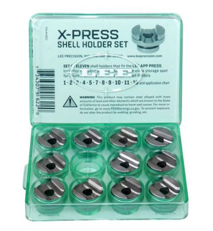 Lee Set of X-press shell holders for the App press, includes 11 of the most popular for more than 115 different cartridges. Includes #1, 2, 3, 4, 5, 7, 8, 9, 10, 11 and 19